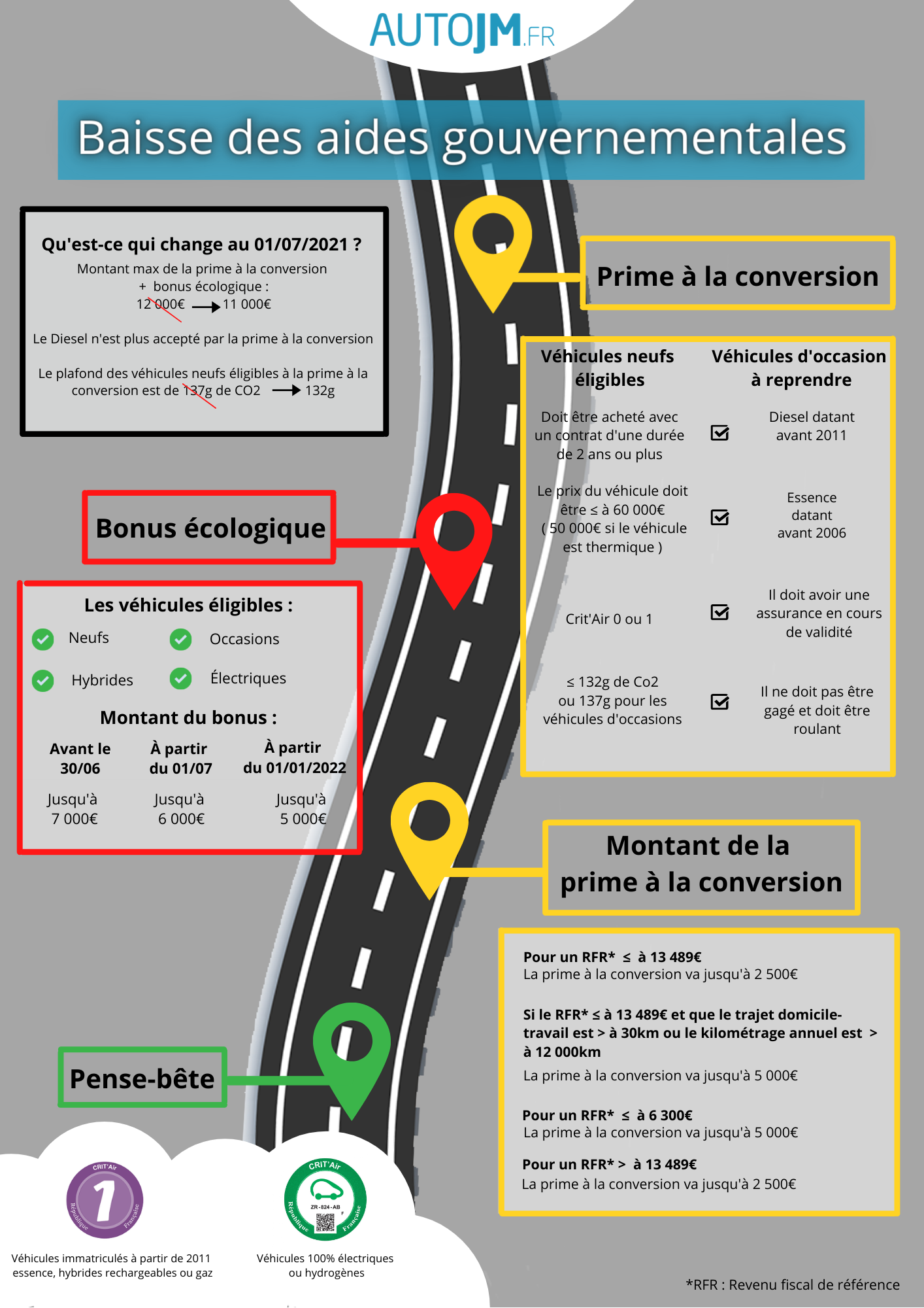 Dans le cadre de la transition écologique, le nouveau montant de la prime à la conversion dépend de nombreux critères, mais le point de référence est votre Revenu Fiscal de Référence par part (condition de revenu).